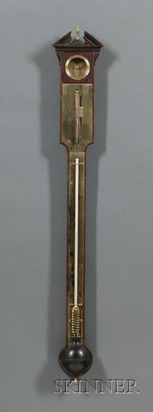 Mahogany Veneer Stick Barometer, London, early 19th century, broken arch pediment over engraved brass plate inscribed 'Gilbert Lud'g: Street London,' with mahogany veneered trunk and circular domed mahogany cistern cover, (repairs),ht. 42 1/4 in.