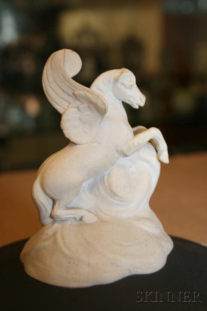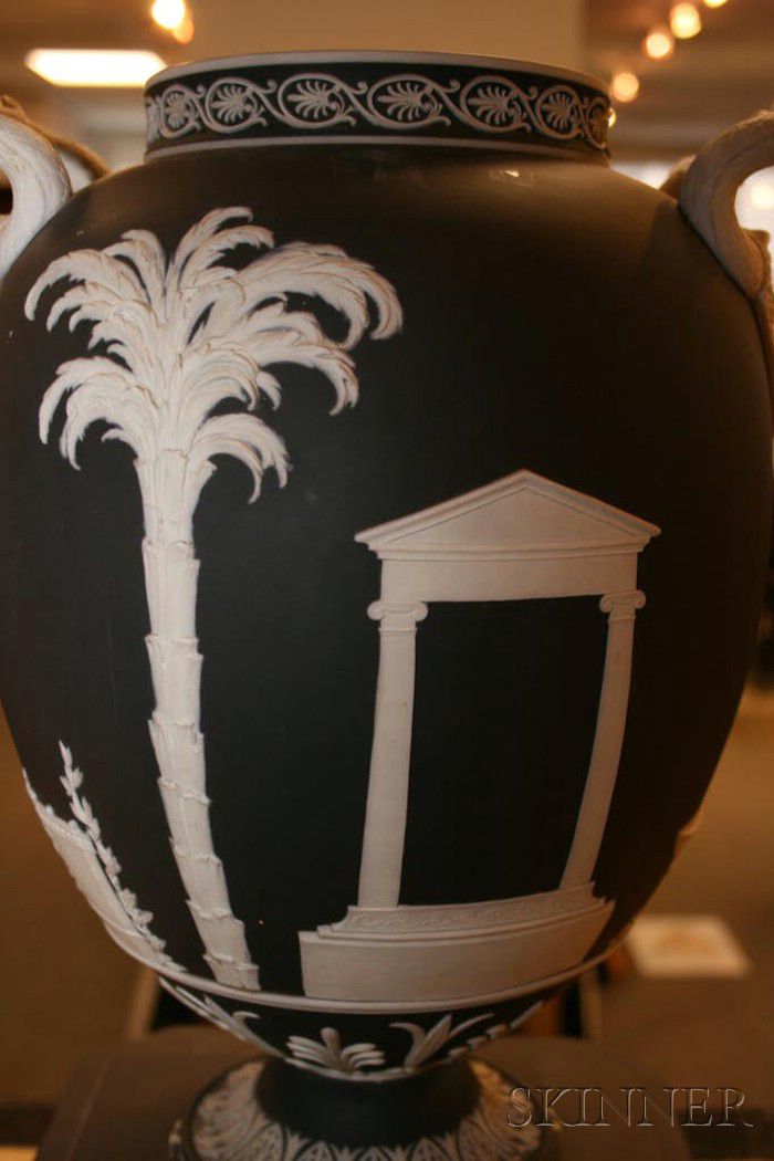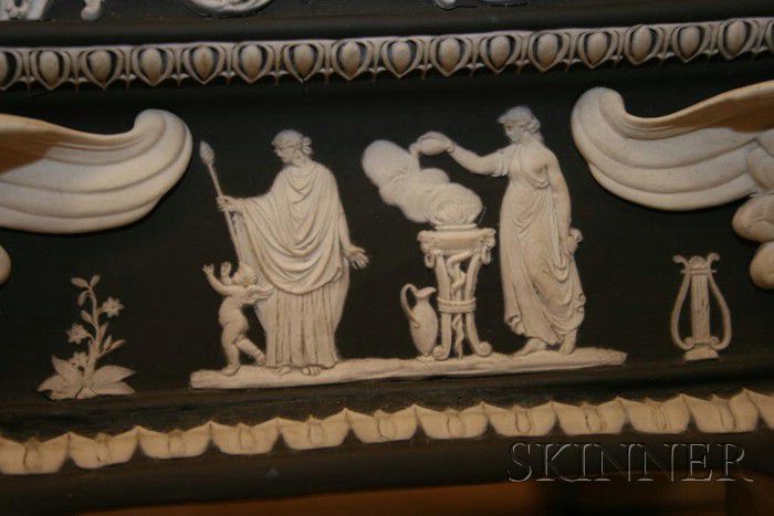 Wedgwood Black Jasper Dip Apotheosis of Homer Vase and Cover, England, 19th century, applied white relief, the cover with Pegasus finial, the vase having Medusa mask and snake handles, classical figures and borders of anthemion and stylized foliage, set on a raised octagonal plinth with griffin figures at each foot and scrolled foliage and panels of classical figures, impressed mark, ht. 24 1/2 in.
