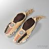 Pair of Beaded Hide Comanche Moccasins, c. late 19th century, with red pigment and tin cones down the vamp and long heel fringe, detailed with multicolored geometric beadwork, lg. excluding fringe 10 in.
