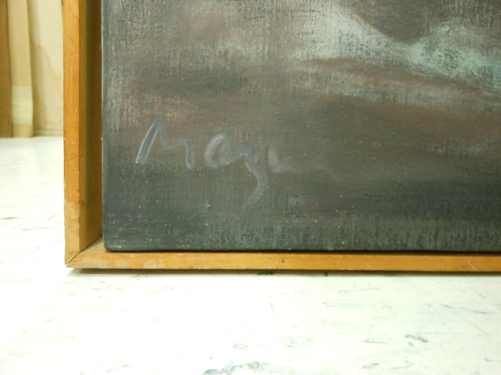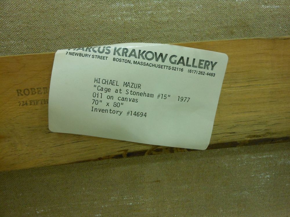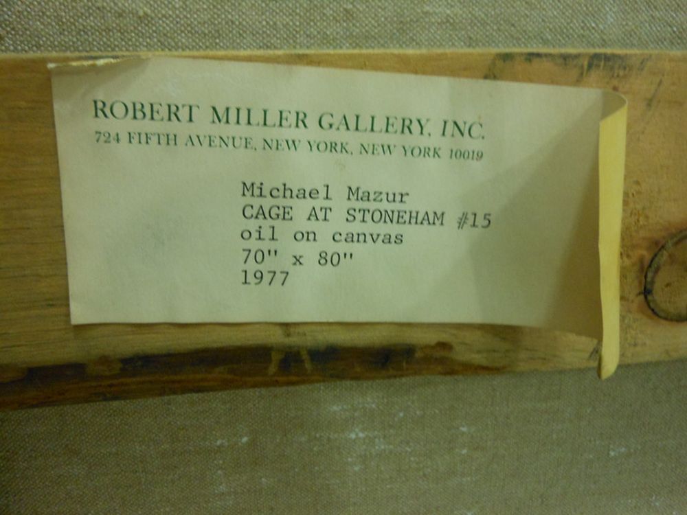 Cage at Stoneham, #15. Signed "Mazur" l.l., titled, dated, and inscribed ".../© 1977 (oil)/..." on the reverse, identified on labels from Robert Miller Gallery, Inc., New York, and Harcus Krakow Gallery, Boston, affixed to the stretcher. Oil on canvas, 70 x 80 in., framed. Condition: Good.