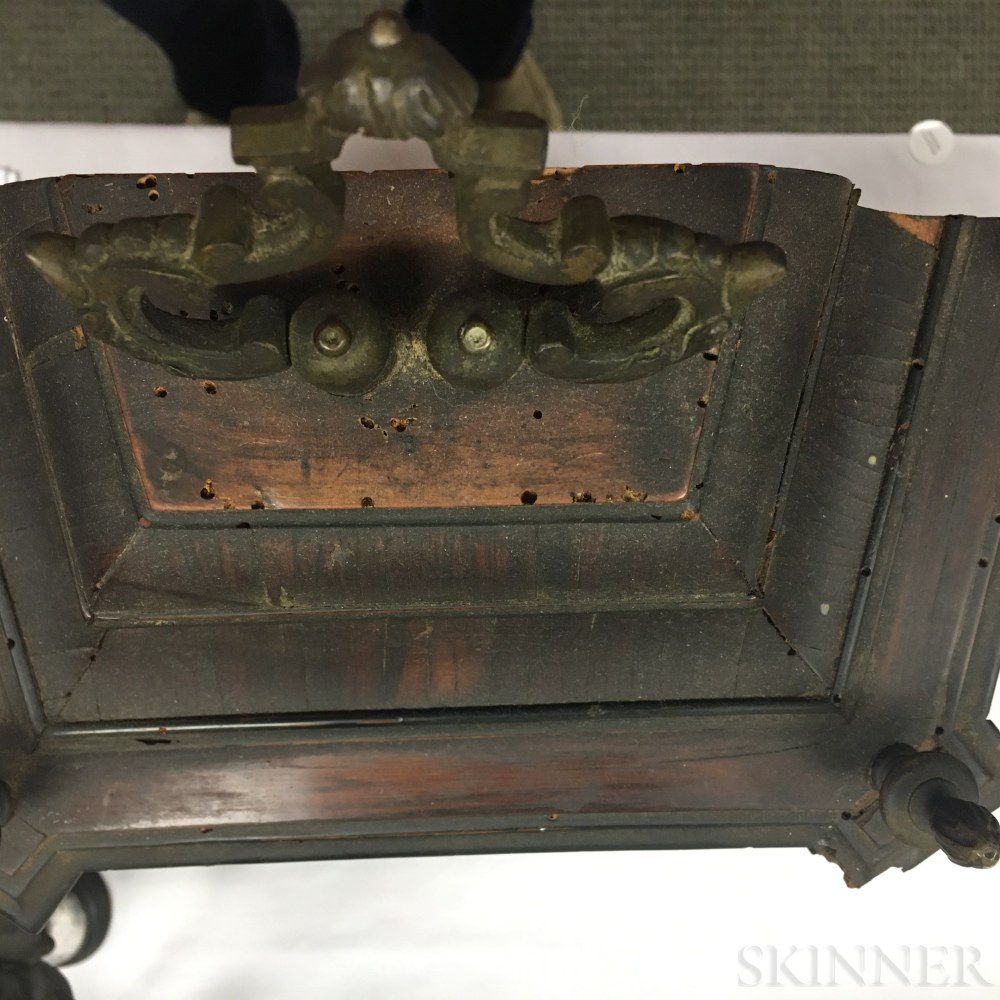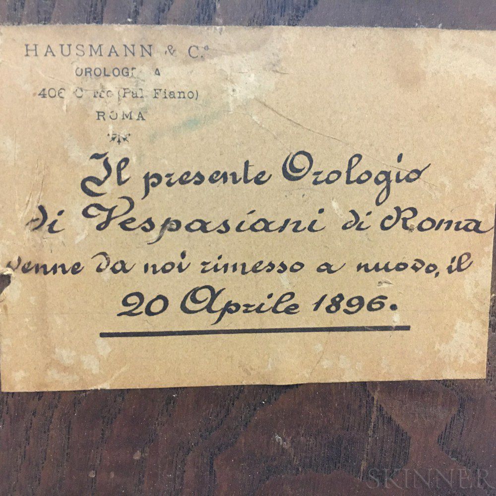 Early Italian Rosewood Veneered Alarm Table Clock, dome-top case with brass bail handle and four flame finials, applied brass mounts and pierced sound frets above the composite brass dial with name boss in the arch reading "Vespasian/Roma," applied pierced brass spandrels, roman numeral chapter ring, alarm disk, false pendulum aperture, and pierced iron hands, all resting on a stepped, molded base and four foliate design feet, eight-day half-hour strike on two bells with crown-wheel escapement and pull repeat, ht. with handle extended 21 in.