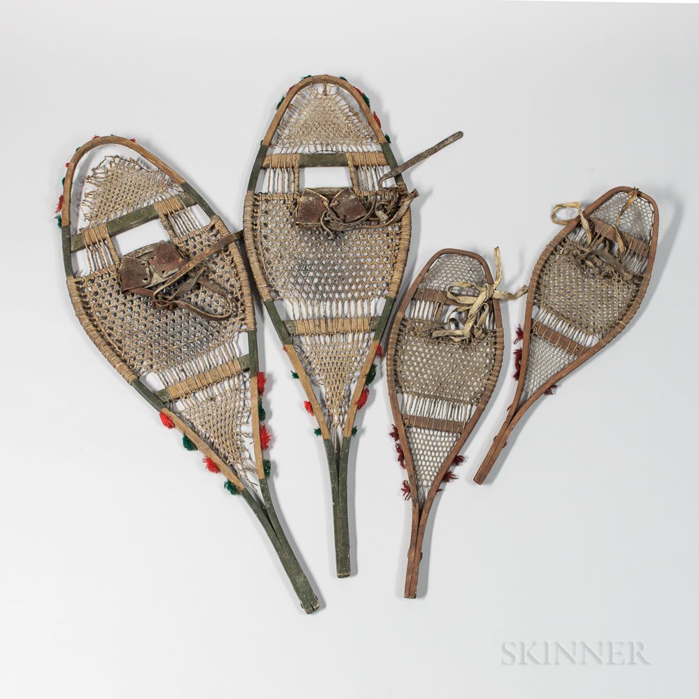 Two Pairs of Northeast Wood and Rawhide Snowshoes, c. 19th century, remnant pigments on the larger pair, both decorated with wool tufts, lg. 42 1/2 and 28 in.